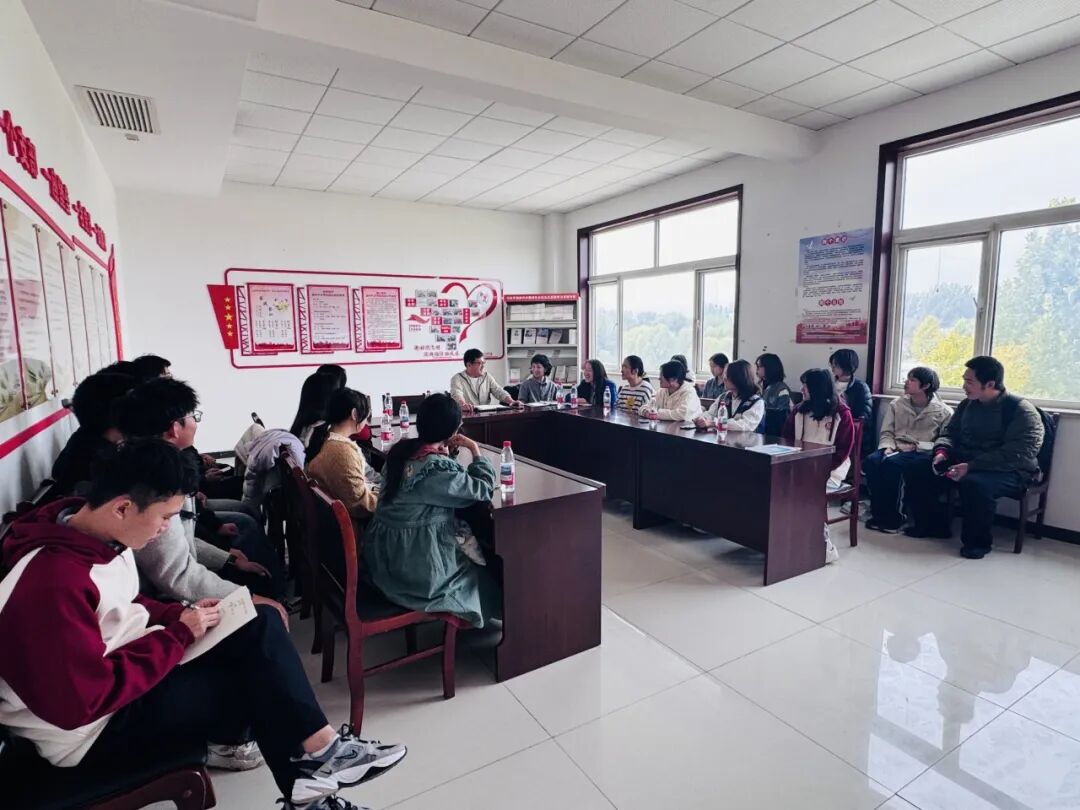 师生们到达南尚岗村之后,兵分两路,乡工项目组社工硕士直接去到南尚岗村活动中心为老年人开展“重阳拾旧忆,光影映芳华”时尚照片摄影活动;25级社会工作专业的本科生在学院两位老师的带领下来到南尚岗村会议室同马春辉书记和村两委工作人员开展座谈交流。座谈会上,马书记及村两委工作人员介绍了南尚岗村的基本情况和面临的复杂问题,也向大家分享了马书记的治理之道,让大家受益匪浅。
