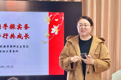活动开场,周少贤老师代表学院对德润十方社工事务所及东风街道的接待表示感谢,她提到,实践教学是社工专业学习的重要环节,期待同学们在交流中沉淀经验、链接理论与实践。随后,德润十方社工事务所所长陈克雨与东风街道张主任共同牵头,为师生展开了一场干货满满的实务分享。