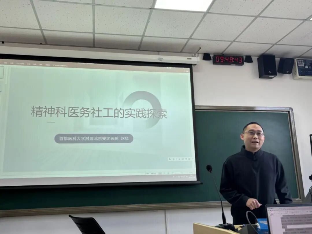 同时,赵猛主任结合实际案例,为同学们介绍了安定医院的医务社会工作实务,包括医务社会工作参与痴呆伴精神行为障碍患者的综合管理模式探索、医务社会工作参与儿童青少年情绪障碍患者综合管理模式的探索、医务社会工作参与康复科综合模式管理、医务社会工作参与临床心理疾病提高患者家庭功能及社会功能的探索、医务社会工作抑郁症治疗项目以及接诉即办项目,让同学们对医务社会工作的实践应用有了更具体的认知。